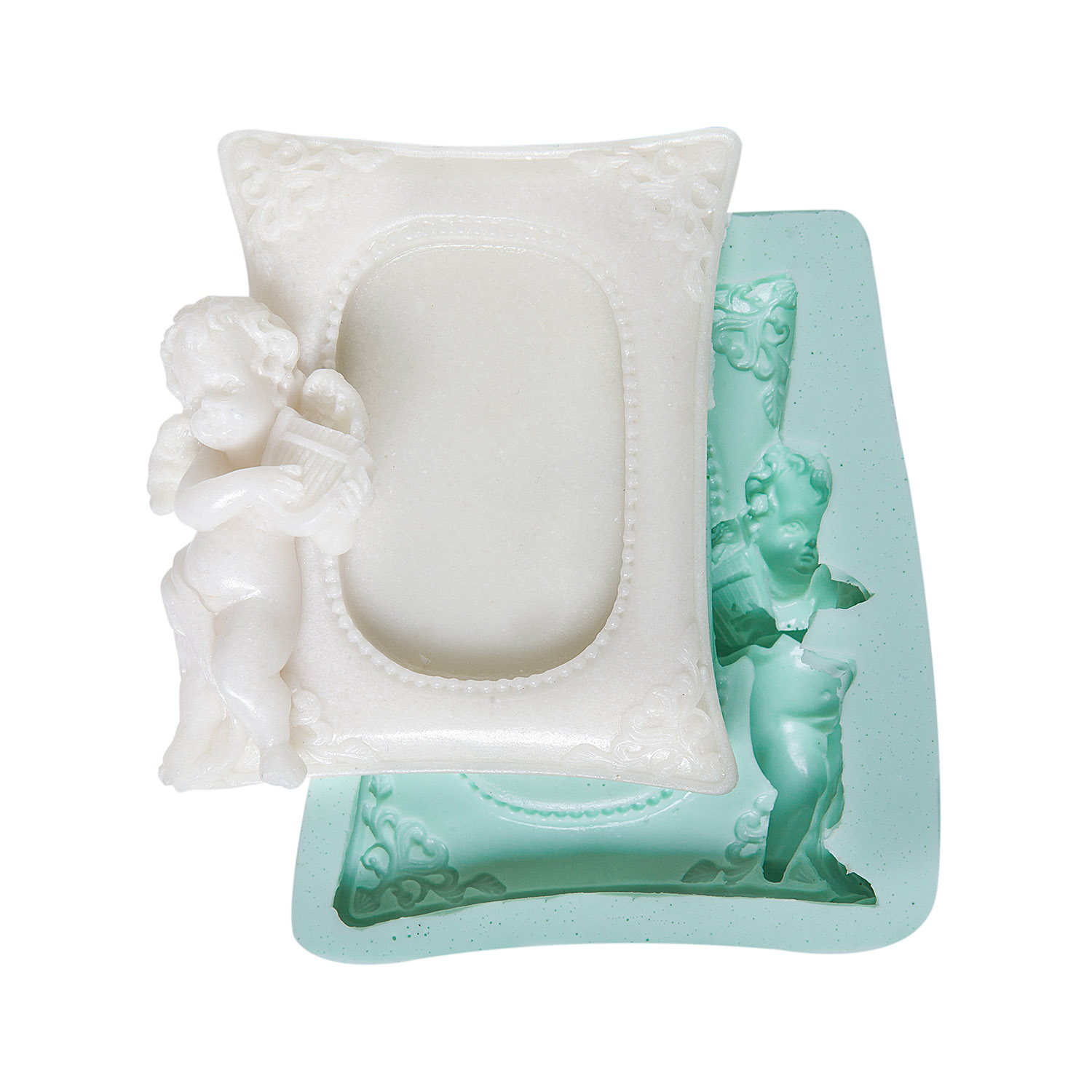 Zarif ayakta duran melek figürü ve detaylı çerçeve tasarımı, koruyucu ve kutsal bir sembol olarak öne çıkar. Pürüzsüz sonuçlar veren kaliteli silikondan üretilen kalıbımız, reçine, alçı ve sabun gibi çeşitli malzemelerle uyumludur.