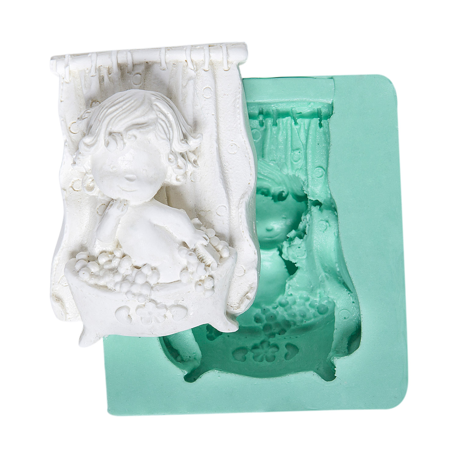Köpük ve su oyunlarının içinde mutlu bir çocuk figürü, günlük hayatın en keyifli rutinlerinden birini canlandırır. Eğlenceli çocuk süsleri için özel tasarlanan silikon kalıbımız, reçine, alçı ve sabun ile mükemmel sonuçlar verir.