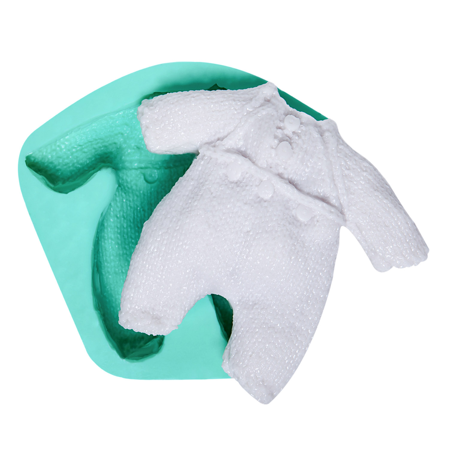 Detaylı bebek tulumu tasarımı, yeni doğan bebeklerin tatlı kıyafetlerini minyatür boyutta yansıtır. Bebek şekeri süsü yapımı için özel formüle edilmiş silikon kalıbımız, reçine, alçı, sabun ve kokulu taş ile en ince detayları bile kusursuz yansıtır.
