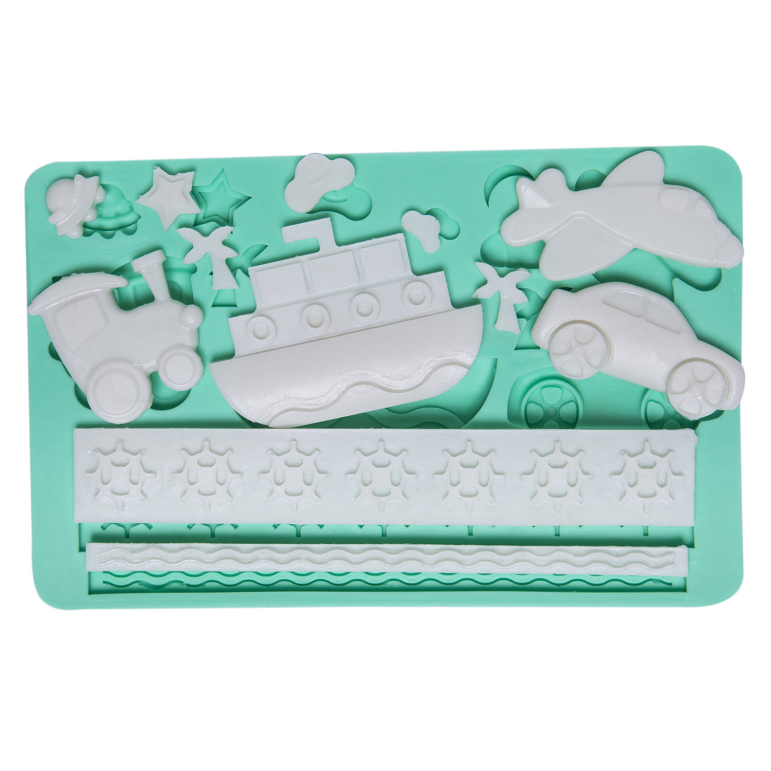 Araba, tren, uçak ve gemi gibi çeşitli taşıtlar ve etraflarındaki dekoratif bordür, ulaşım dünyasının renkli yelpazesini sunar. Erkek çocuk odası için özel tasarlanan silikon kalıbımız, reçine, alçı, sabun ve hamur işlerinde kusursuz sonuçlar verir.