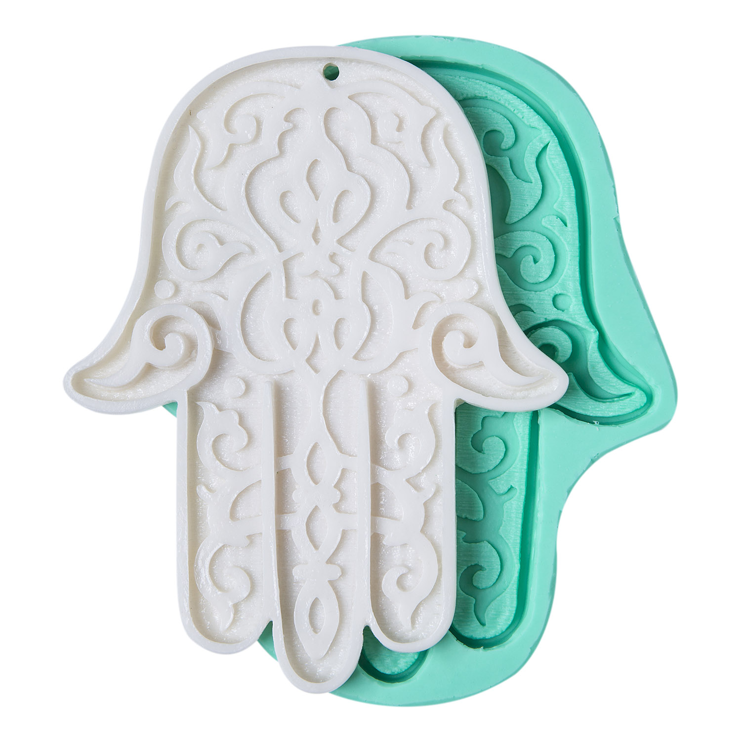 Detaylı motifler ve güçlü sembolik anlamıyla Fatma Ana eli, nazar ve kötülüklere karşı korunma simgesidir. Nazarlık yapımı için özel tasarlanan silikon kalıbımız, reçine, alçı, sabun ve kokulu taş ile mükemmel sonuçlar verir.