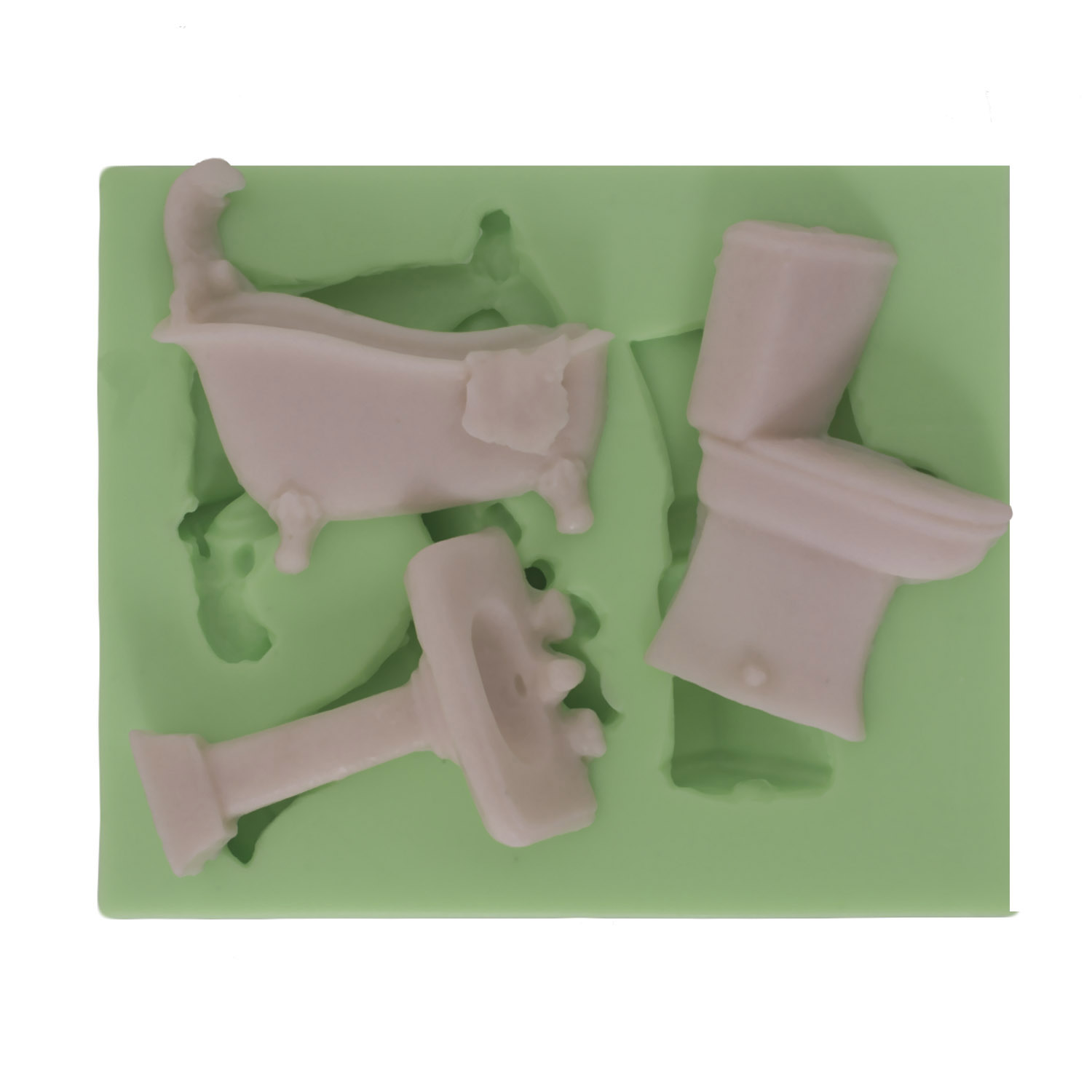Lavabo, klozet ve küvet setinin gerçekçi tasarımı, modern banyo estetiğini küçük ölçekte sunar. Banyo dekorasyonu için özel formüle edilmiş silikon kalıbımız, reçine, alçı ve sabun ile mükemmel sonuçlar verir.