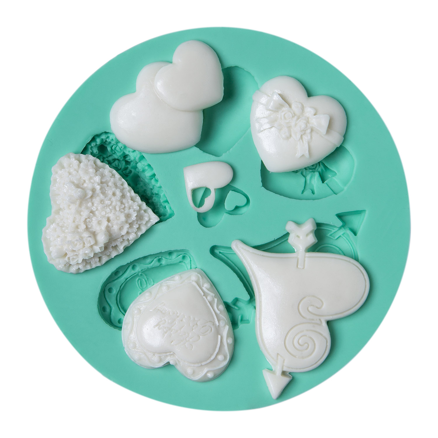 Aşkın çeşitli yüzlerini simgeleyen 5,5x5x1cm boyutlarındaki 6’lı kalp seti kalıbımız, romantik projelerinize çeşitlilik katar.