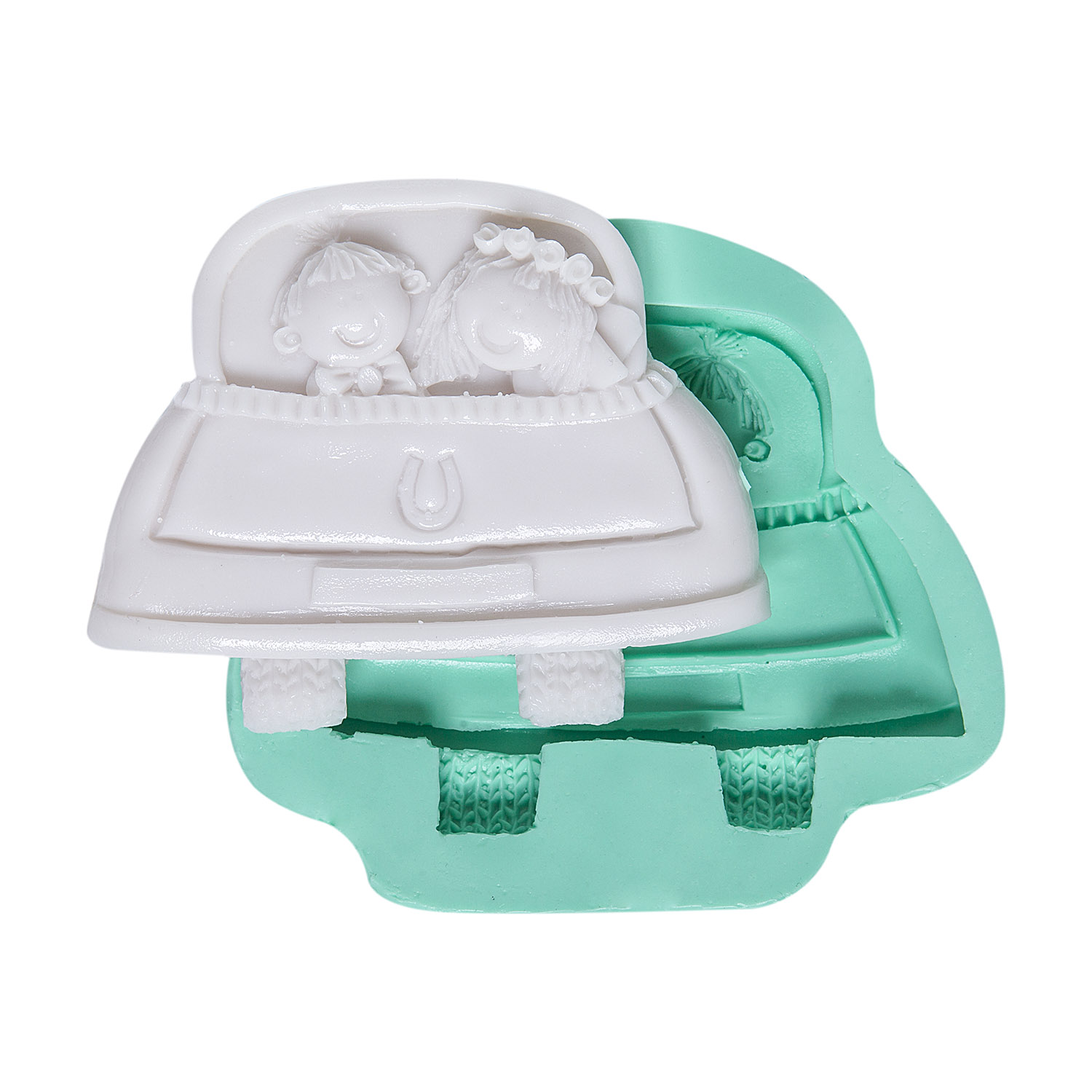 Zarif gelin arabası ve içindeki mutlu çift detayı, evliliğin en özel anını simgeler. Düğün temalı dekorasyon için özel formüle edilen silikon kalıbımız, reçine, alçı ve sabun ile detayları kusursuz şekilde yansıtır.