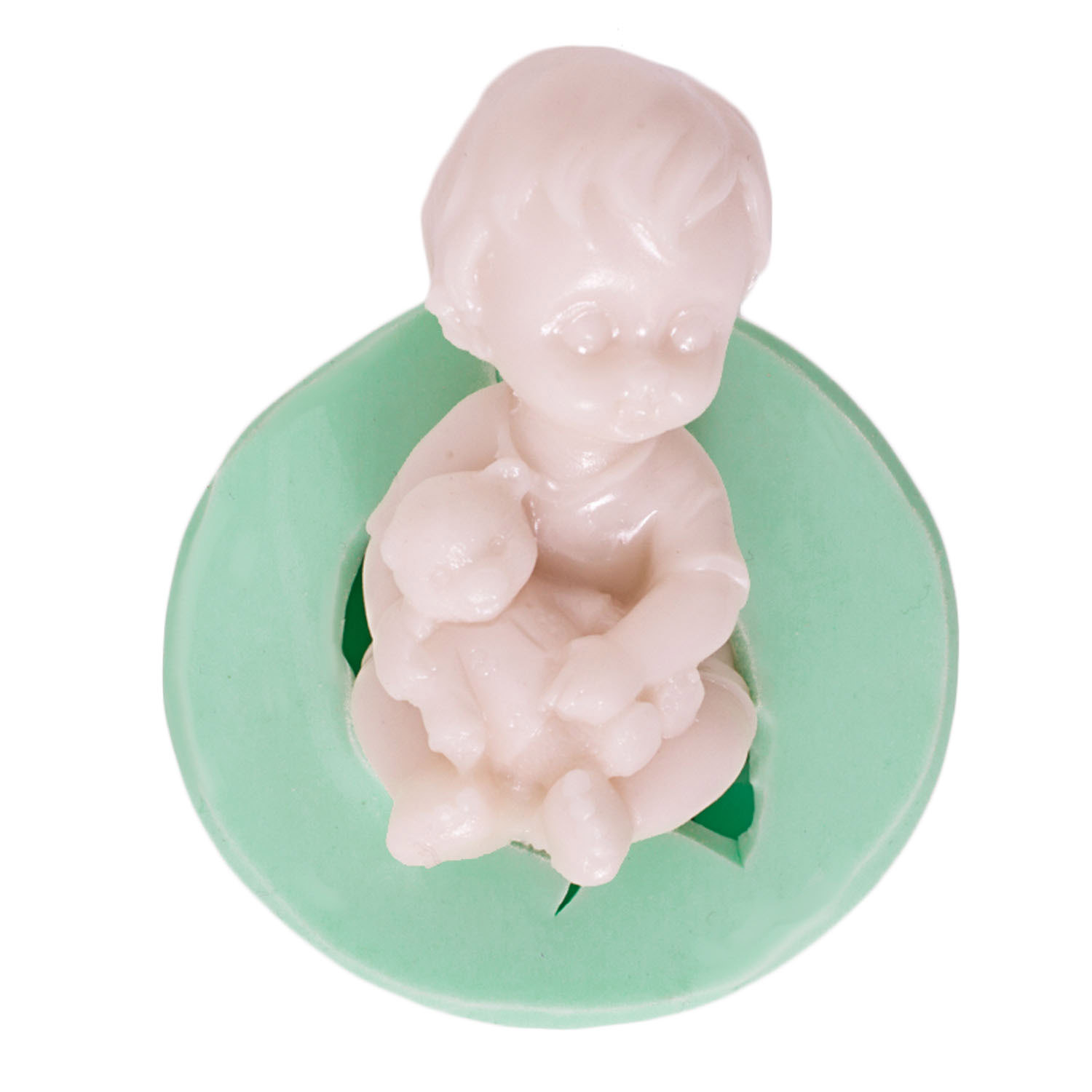 Çocuk masumiyetini yansıtan 3x3x5cm boyutlarındaki ayıcıklı oturan çocuk kalıbımız, sevimli projelerinize şefkat katar.