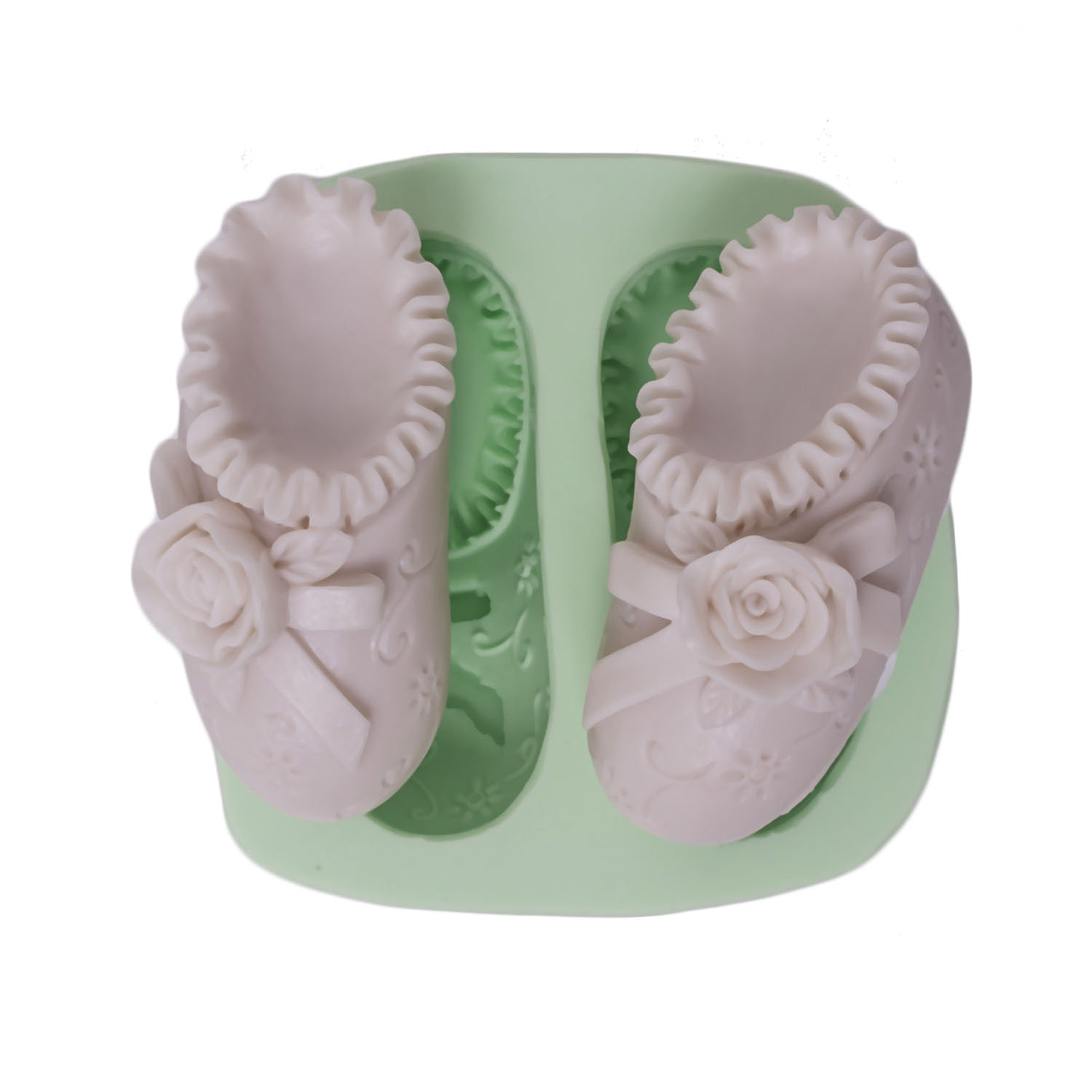 İkili patik formu ve üzerindeki zarif gül süslemeleri, bebekler için özel bir hediye oluşturur. Bebek odası dekorasyonu için özel formüle edilmiş silikon kalıbımız, reçine, alçı, sabun ve kokulu taş ile en ince detayları bile kusursuz yansıtır.