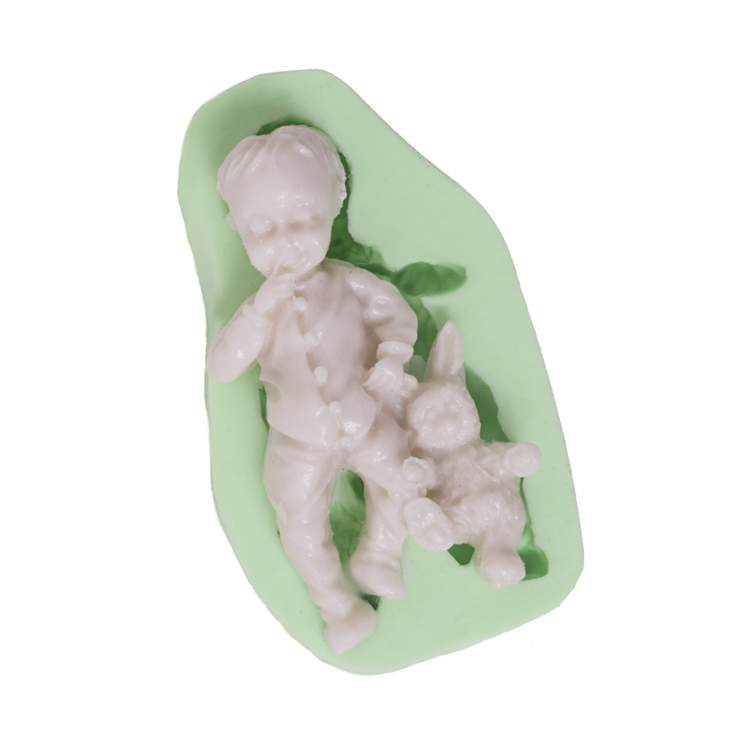 Sevimli erkek çocuk figürü ve oyuncak tavşanı, çocukluk neşesini ve hayal gücünü mükemmel şekilde simgeler. Erkek çocuk odası süsü için özel formüle edilmiş silikon kalıbımız, reçine, alçı, sabun ve kokulu taş ile detayları net şekilde yansıtır.