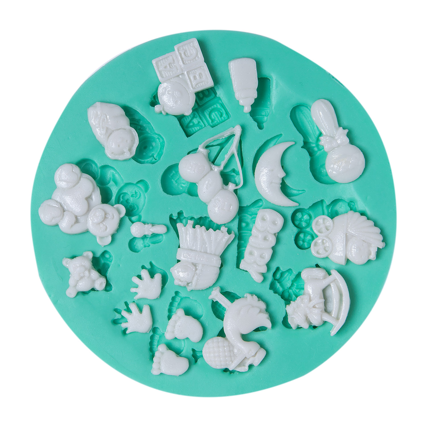 Biberon, bebek arabası, emzik gibi minik bebek figürleri, detaylı şekilde tasarlanmıştır. Bebek şekeri süsü yapımı için özel formüle edilmiş silikon kalıbımız, reçine, alçı, sabun, ve model hamuru ile mükemmel sonuçlar verir.