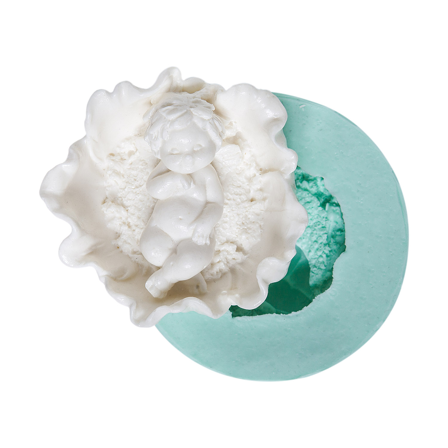 Kurdelya Yaprağın İçinde Uyuyan Çocuk Silikon Döküm Kalıbı (Doğa Masalları – 6,5×6,5x3cm – KK-0235)