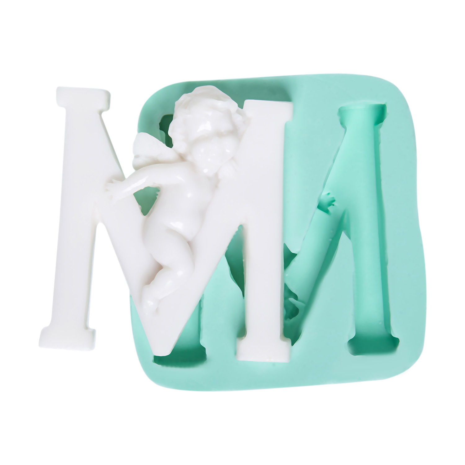 M harfinin tepe noktalarına yerleştirilmiş melek figürleri, hareketli forma maneviyat kazandırır. Kişiselleştirilmiş dekorasyon için özel tasarlanan silikon kalıbımız, reçine, alçı, sabun ve kokulu taş ile en ince detayları bile kusursuz yansıtır.