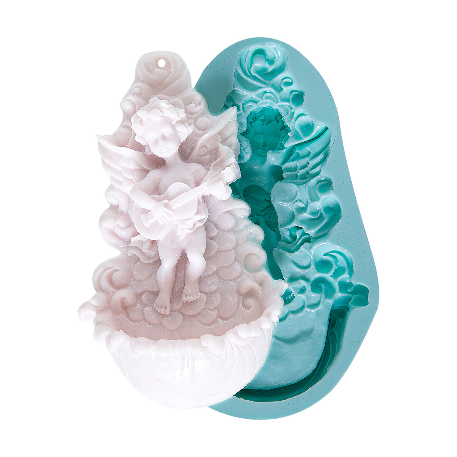 Zarif melek figürü ve elindeki gitar detayı, musiki ve tinselliği bir araya getirir. Müzik temalı dini süs için özel formüle edilmiş silikon kalıbımız, reçine, alçı, beton ve seramik hamuru ile mükemmel sonuçlar verir.
