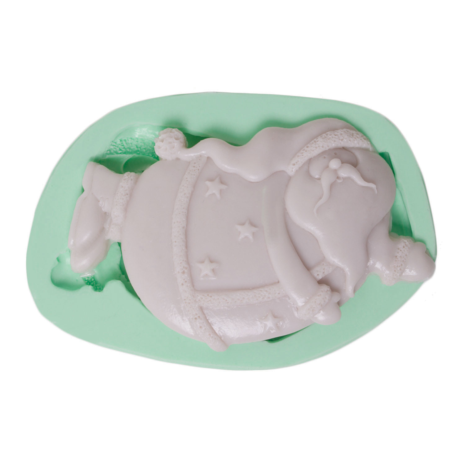 Sağa doğru uçarken resmedilen Noel Baba figürü, hediye torbasıyla kış kutlamalarının ikonik sembolüdür. Yılbaşı süsü için özel formüle edilmiş silikon kalıbımız, reçine, alçı, sabun ve kokulu taş ile detayları kusursuz şekilde yansıtır.